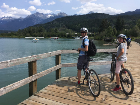 De eerste dag huren we fietsen (even ter vergelijk: op Texel kost een fiets huren 10 euro per dag, in Vancouver 15 euro per dag en in Whistler kost een dag een normale fiets 30 euro). In de vallei zijn ontzettend veel fietspaden, we maken een route langs alle vijf de meren. De omgeving is prachtig, heel mooi uitzicht op de omringende bergen en er is een leuk riviertje waar we een stuk langs fietsen: de Golden River. Hier zijn veel mensen met de stroom mee aan het kajakken of in een opblaasboot aan het meedrijven. We zien parachutespringers landen in Meadow park waar we onze lunch eten. Er zijn maar liefst drie golfbanen, allemaal even prachtig gelegen, en we fietsen langs alle drie. Op Green Lake landen ook weer watervliegtuigen, erg leuk om naar te kijken.